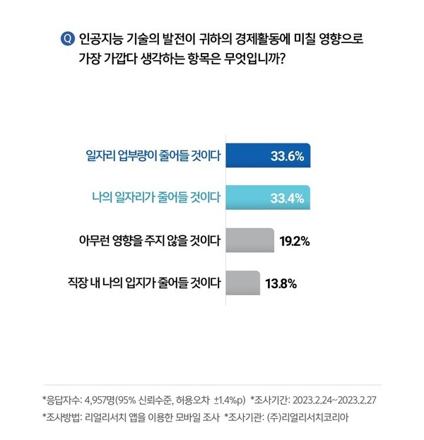 리서치 전문기업 리얼리서치코리아가 지난달 24일부터 28일까지 자체 패널 4957명 대상으로 '인공지능(AI)의 발전(챗GPT)'에 대한 설문조사를 실시했다.
