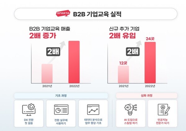 에듀테크 스타트업 팀스파르타는 ‘스파르타코딩클럽’의 2022년 B2B 사업 매출이 1년 만에 100% 급성장을 기록했다고 15일 밝혔다. 지난해 B2B 영역에서 전년대비 2배 성장을 기록한 팀스파르타는 올해 더욱 세분화된 커리큘럼 로드맵을 그리며 신성장 동력으로 B2B 사업의 비약적인 성장을 일궈내겠다는 각오다.
