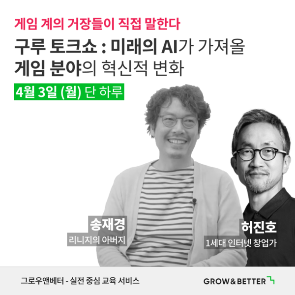 실전 중심 온라인 교육 서비스인 그로우앤베터는 오는 4월 ‘바람의 나라’, ‘리니지’ 를 제작한 엑스엘게임즈 송재경 대표와 함께 게임 업계 AI 트렌드에 대해 이야기를 나누는 토크쇼를 개최한다고 밝혔다.