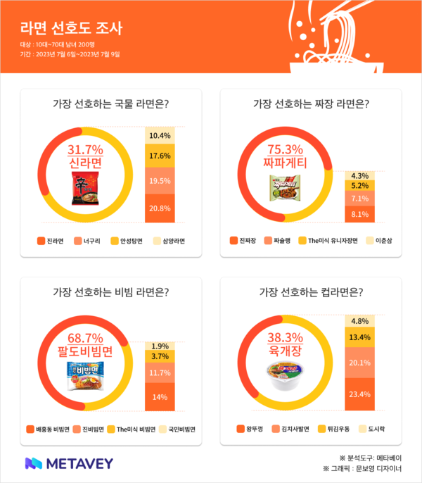 데이터 기반 리서치 기업 메타서베이(MetaSurvey)가 라면 브랜드 선호도조사를 실시했다. 조사 기간은 7월 6일부터 7월 9일까지로 10대~70대 남녀 총 200명이 설문에 참여했다.