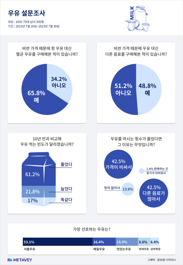 데이터 기반 리서치 기업 메타서베이(MetaSurvey)가 신개념 서베이 메타베이를 통해 7월 26일부터 7월 30일까지 우유 관련 설문조사 진행했으며, 10대~70대 남녀 총 200명이 응답했다.