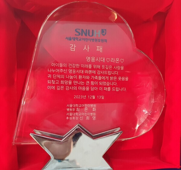 최은화 서울대어린이병원장은 “중증 어린이·청소년 환자와 가족들에게 보내주신 따스한 관심에 감사드린다”며 “임영웅씨와 영웅시대 라온의 선한 뜻이 어린이 환자와 가족들에게 잘 전달될 수 있도록 후원금을 소중히 사용하겠다”고 했다.