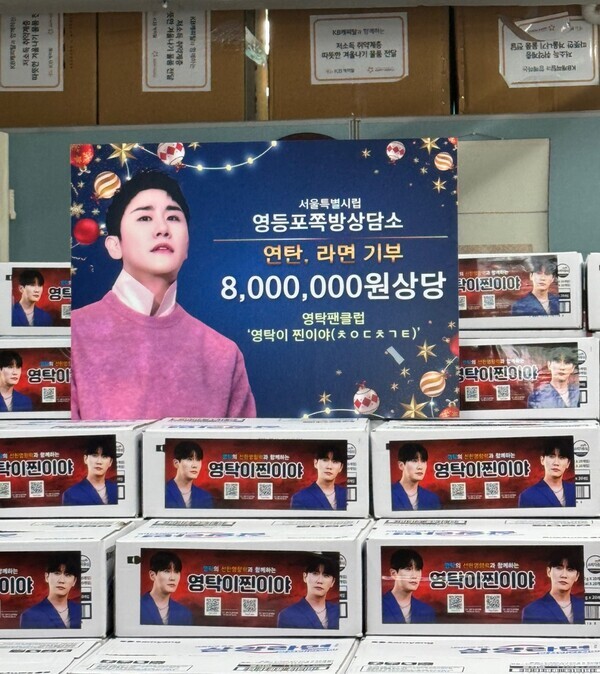 '영탁이찐이야' 회원들은 영등포 쪽방촌을 찾아가 연탄과 라면 800만 원 상당을 '영등포 쪽방상담소'에 16일 기부했다고 밝혔다.