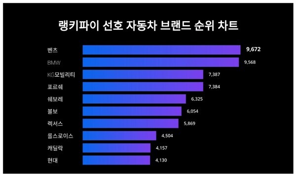BMW은 9,568포인트로 전주보다 163포인트 상승해 2위를 차지했고, KG모빌리티는 7,387포인트로 전주보다 1,981포인트 하락해 3위를 차지했다.
