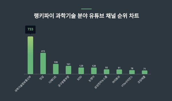 [CWN 김해남 기자] 랭키파이가 발표한 2024년 1월 2주차 과학기술 분야 유튜브 채널 트렌드 지수에 따르면 과학기술정보통신부의 트렌드지수는 733포인트로 전주보다 237포인트 상승하면서 1위를 차지했다.