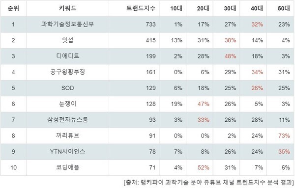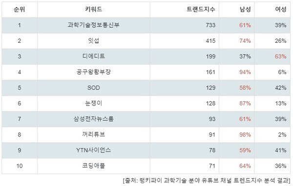 1위 과학기술정보통신부, 2위 잇섭, 3위 디에디트...1월 2주차 과학기술 분야 유튜브 채널 트렌드지수 순위 결과 발표