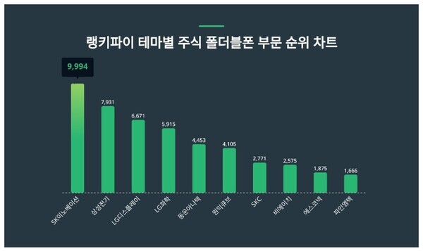 1위 SK이노베이션 주가는 트렌드지수 9,994점으로 전주 9,155점보다 839점 상승했다.