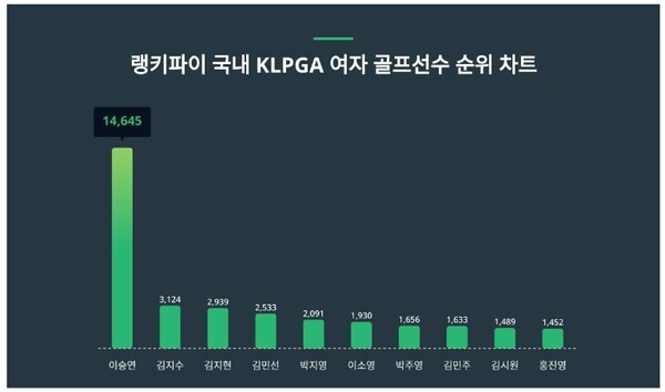 [CWN 김해남 기자]랭키파이가 발표한 1월 2주차 국내 KLPGA 여자 골프선수 트렌드 지수에 따르면 이승연의 트렌드지수는 14,645포인트로 전주보다 3,064포인트 하락해 1위를 차지했다.