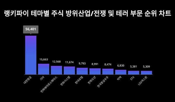 이어 6위 한화오션 주가는 트렌드지수 8,991점, 7위 한국항공우주 주가는 트렌드지수 8,474점, 8위 빅텍 주가는 트렌드지수 6,830점, 9위 STX 주가는 트렌드지수 5,381점, 10위 LIG넥스원 주가는 트렌드지수 5,309점 순으로 나타났다.