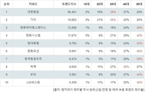 테마별 주식 방위산업/전쟁 및 테러 부문 트렌드 지수 데이터는 대한항공 마일리지, 대한항공 고객센터, 대한항공 채용, 대한항공 마일리지 사용, 대한항공 예약, 한화에어로스페이스 채용, 한화에어로스페이스 주가, 한화에어로스페이스 연봉, 한화에어로스페이스 (창원), 한화에어로스페이스(주) 등의 키워드 및 트렌드를 분석한 결과이다.