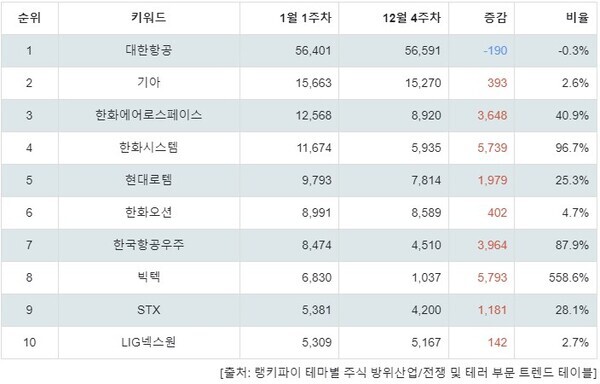 [CWN 김해남 기자] 랭키파이 2024년 1월 2주차 트렌드지수 분석 결과 테마별 주식 방위산업/전쟁 및 테러 부문 트렌드지수에서 대한항공 주가가 1위를 차지했다.