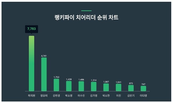 이어 11위는 이지원, 12위 이호정, 13위 이나경, 14위 김하나, 15위 이미래, 16위 김이서, 17위 박선주, 18위 김연정, 19위 김진아, 20위는 이아영 순으로 나타났다.