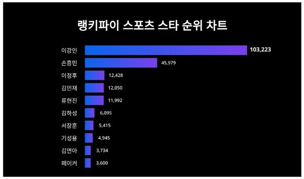 손흥민은 45,979포인트로 전주보다 11,823포인트 상승해 2위를 차지했으며, 이정후는 12,428포인트로 전주보다 2,074포인트 상승해 3위를 차지했다. 이어 김민재, 류현진, 김하성, 서장훈, 기성용, 김연아, 페이커가 그 뒤를 이어 4위~10위를 차지했다.