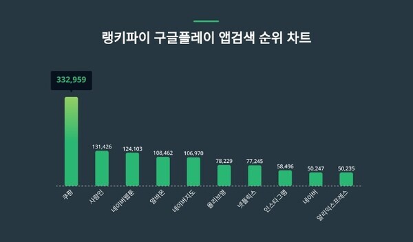 [CWN 김해남 기자] 랭키파이가 발표한 1월 3주차 구글플레이 앱검색 트렌드 지수에 따르면 쿠팡의 트렌드지수는 332,959포인트로 전주보다 16,760포인트 상승해 1위를 차지했다.