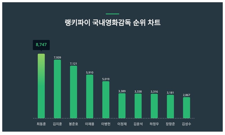 [CWN 김해남 기자] 랭키파이가 발표한 2024년 1월 3주차 국내영화감독 트렌드지수에 따르면 최동훈의 트렌드지수가 8,747포인트로 전주보다 4,123포인트 상승하면서 1위를 차지했다.