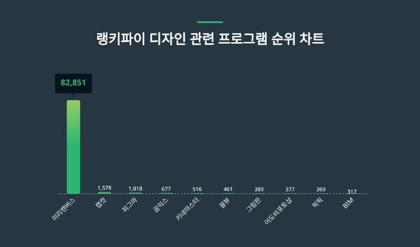[CWN 김해남 기자] 랭키파이가 발표한 2024년 2월 1주차 디자인 관련 프로그램 트렌드 지수에 따르면 미리캔버스의 트렌드 지수는 82,851포인트로 전주보다 18,096포인트 상승하면서 1위를 차지했다.