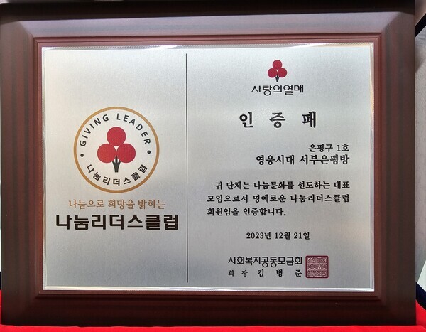 1000만원 이상 기부를 약정하는 모임인 나눔리더스클럽 은평 1호 인증패도 수여받았다.