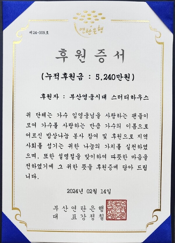 부산영웅시대 '스터디하우스'는 '혼자가 아닌 같이의 힘으로' 라는 슬로건으로 "앞으로도 독거노인들을 위해 지속적으로 후원과 봉사를 하며 임영웅의 선한영향력을 널리 퍼뜨리겠다"고 전했다.