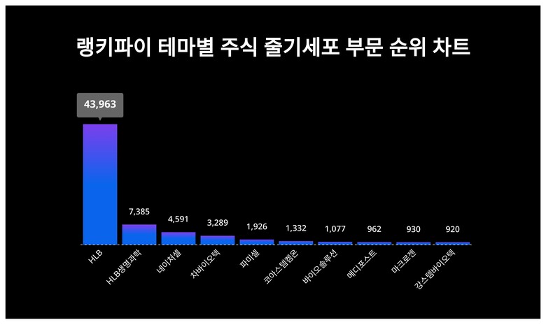 1위 HLB 주가는 트렌드지수 43,963점으로 전주 72,566점보다 28,603점 하락했다.