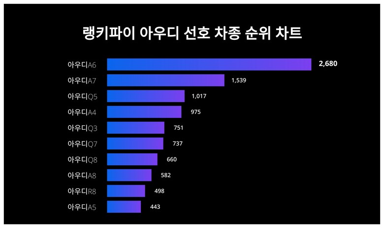 또 4위 아우디A4은 975포인트, 5위 아우디Q3은 751포인트, 6위 아우디Q7은 737포인트, 7위 아우디Q8은 660포인트, 8위 아우디A8은 582포인트, 9위 아우디R8은 498포인트, 10위 아우디A5은 443포인트이다.