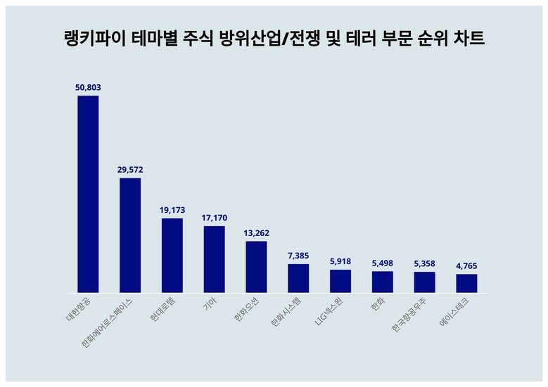 [출처: 랭키파이 테마별 주식 방위산업/전쟁 및 테러 부문 트렌드 테이블]
