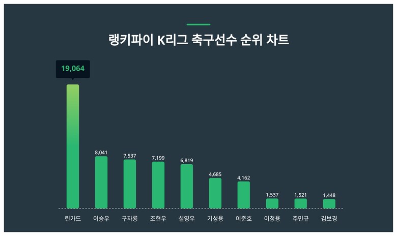 [CWN 김해남 기자] 랭키파이가 발표한 2024년 3월 1주차 K리그 축구선수 트렌드 지수에서 린가드가 트렌드 지수 19,064포인트로 1위에 올랐다.