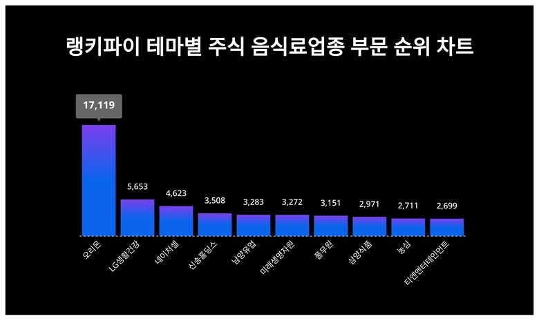 또 11위 HK이노엔 주가, 12위 우듬지팜 주가, 13위 오뚜기 주가, 14위 대상 주가, 15위 매일유업 주가, 16위 하이트진로 주가, 17위 CJ제일제당 주가, 18위 대한제당 주가, 19위 샘표식품 주가, 20위는 디딤이앤에프 주가로 나타났다.